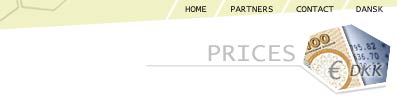 For work outside Danmark the prices are found here and are in € ex VAT. For work inside Danmark see prisliste |